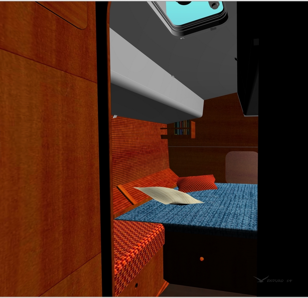 In addition to the small midship cabin with a single berth on port side, a dedicated seaberth close to the companionway on starboard prevents having crew sleeping and seizing the saloon during rough navigations; so it can still be used even with strong weather conditions outside for eating, relaxing, reading or watching movies.