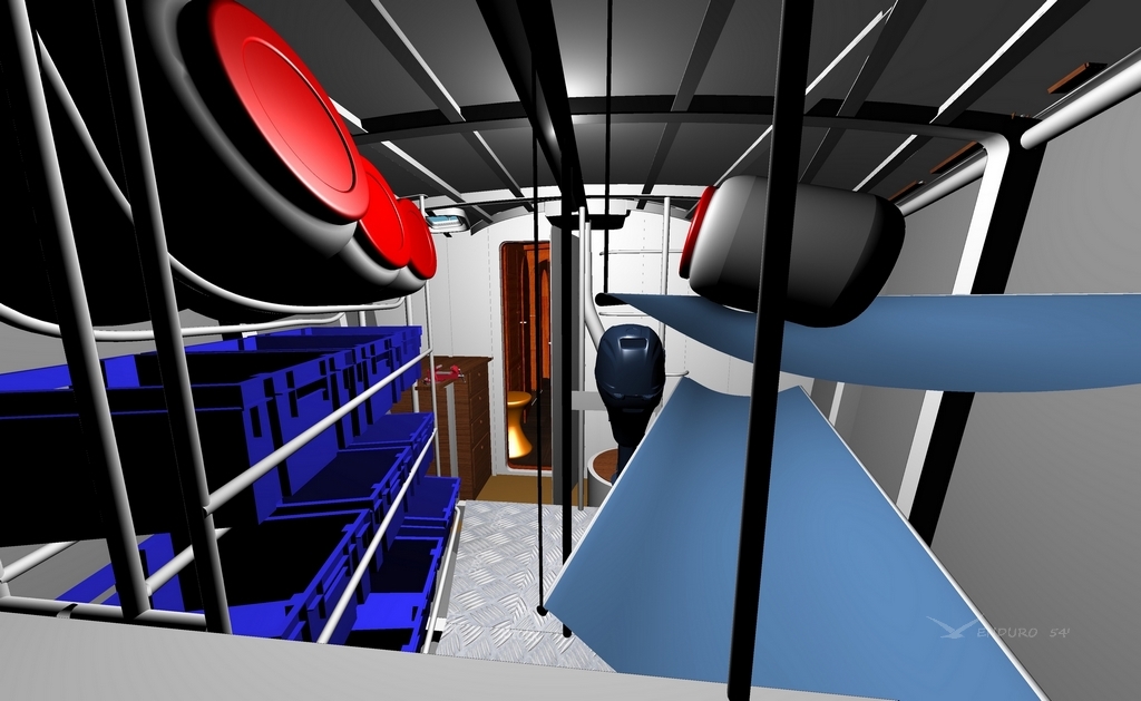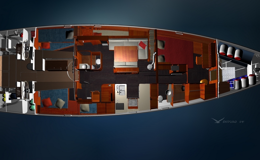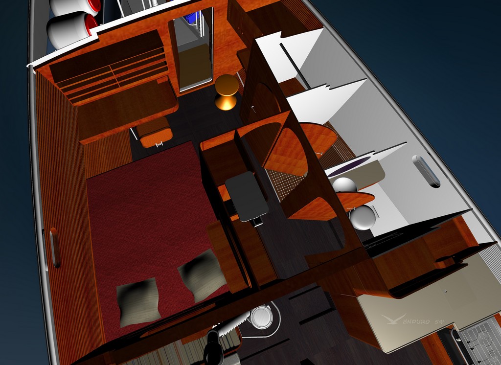 The most forward and central owner's cabin aft of the 3m long forepeak has its bed offset and at the mast foot. As a matter of fact fore-cabins too close to the bow aren’t a lot of use at sea (boat motions and difficult ventilation), and when on passage these cabins usually become a stowage area, so with already enough berths on board we elected to have a vast walk-in forepeak with a workbench instead.