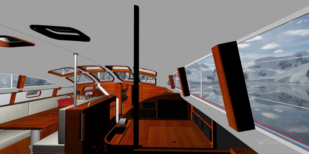 The pilothouse, which includes a navigation station with chart table and inside steering, extends forward over a comfortable raised saloon, and a U shape galley opposite, to form a spacious atrium. Light and airy, without wide open spaces for bodies to fly across, in addition to numerous secure handholds.